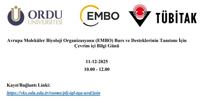 Yaşam bilimleri alanında dünyanın öncü kuruluşlarından biri olan Avrupa Moleküler Biyoloji Organizasyonu (EMBO) tarafından sağlanan burs ve destek programlarını tanıtmak amacıyla; TÜBİTAK'ın sunduğu "Avrupa Moleküler Biyoloji Organizasyonu (EMBO) Burs ve Desteklerinin Tanıtımı için Çevrim İçi Bilgi Günü" başlıklı çevrim içi etkinlik Üniversitemiz bünyesinde düzenlenecektir.